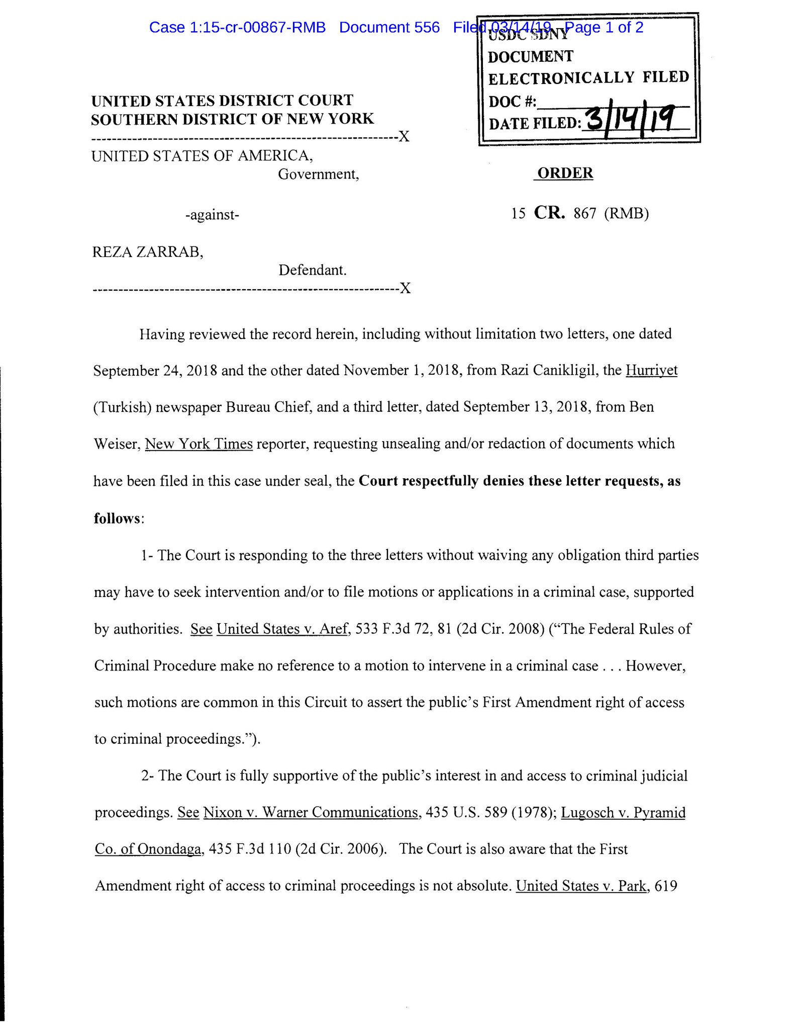 Benjamin Weiser Ar Twitter Judge Denies Request From The New York Times And The Turkish Newspaper Hurriyet To Release Confidential Court Documents Relating To Reza Zarrab The Turkish Iranian Gold Trader Who Pleaded